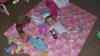 She gets super excited when you hand her something that she can shake. She loves playing with wipes. Her all time favorite “toy” is her feet.
