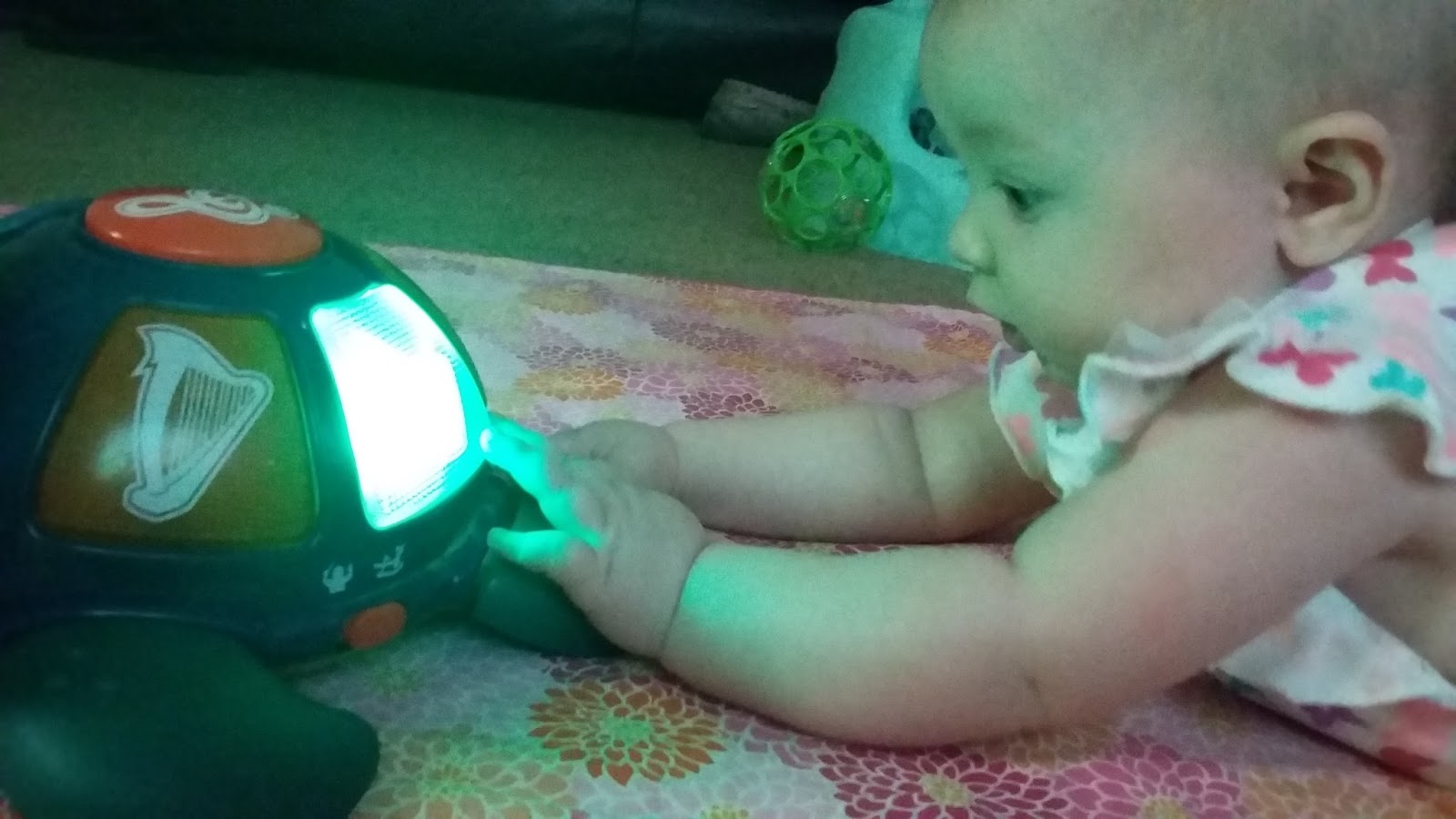 She gets super excited when you hand her something that she can shake. She loves playing with wipes. Her all time favorite “toy” is her feet.