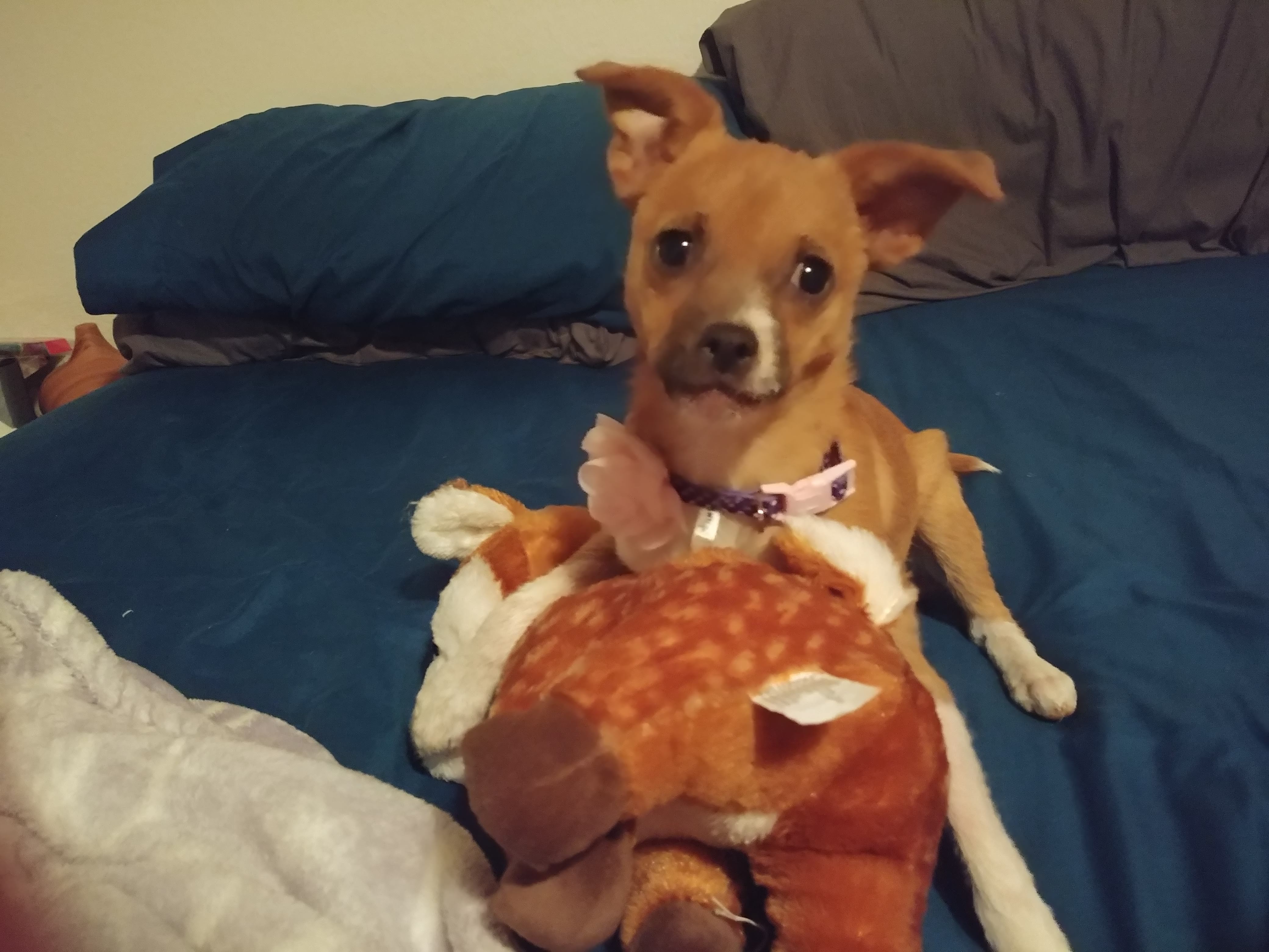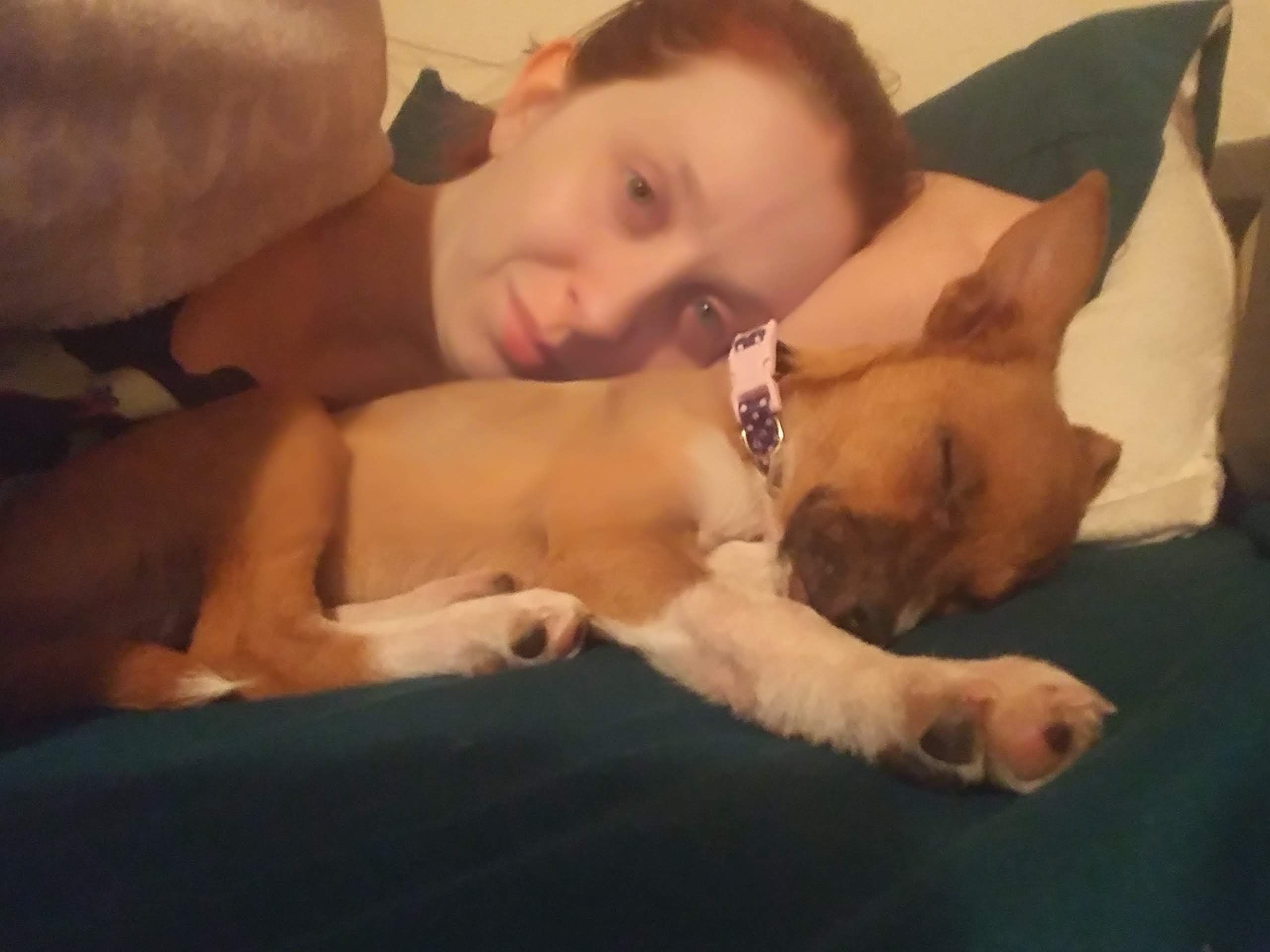 Her name is Peanut and she’s about 18 weeks old right now and she’s a mix between a Terrier and German Shepard. She is the happiest , most playful little puppy ever, but she isn’t like most puppies I’ve had. She sleeps when I sleep even if it’s taking a nap. She follows me EVERYWHERE and I take her pretty much everywhere. She gives kisses on command and is getting really close to being able to shake on command.